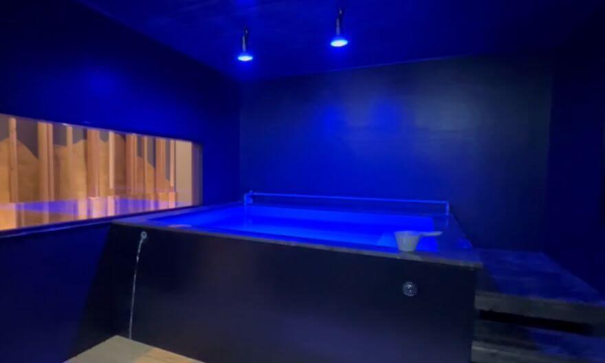 青いLEDでより冷たく感じるよう演出された水風呂です。