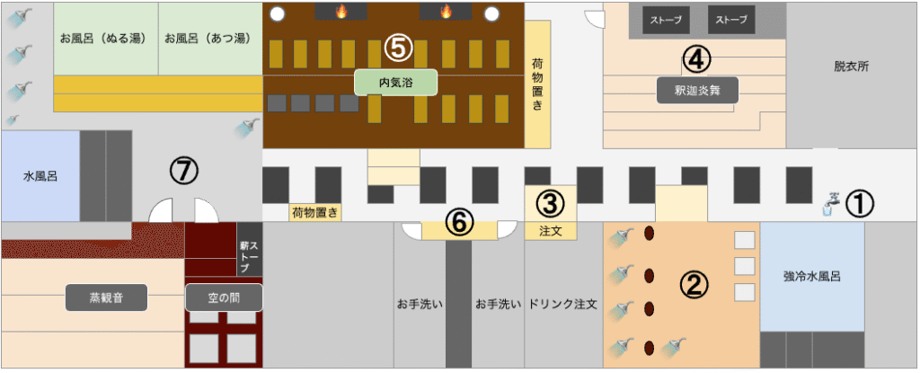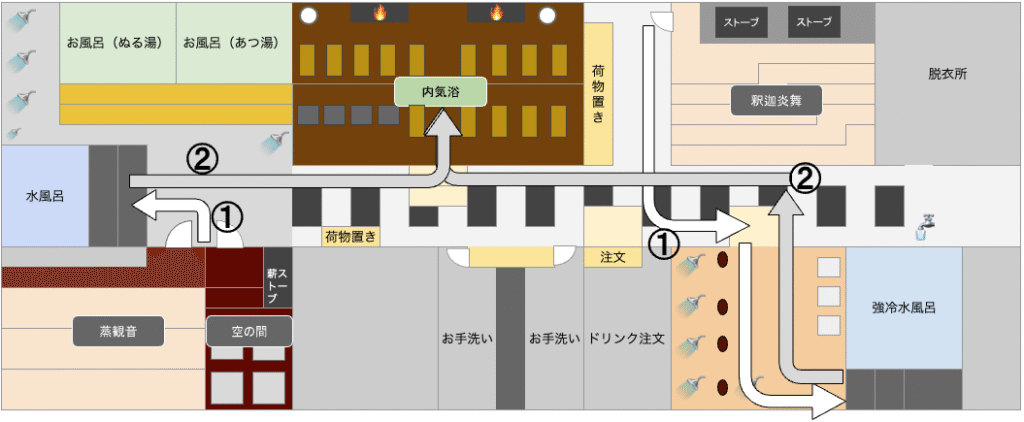 ※ただ、上記のセットを崩すと(例えば蒸観音→強冷水風呂など)、行ったり来たりとなるためかなり動線は悪くなります。