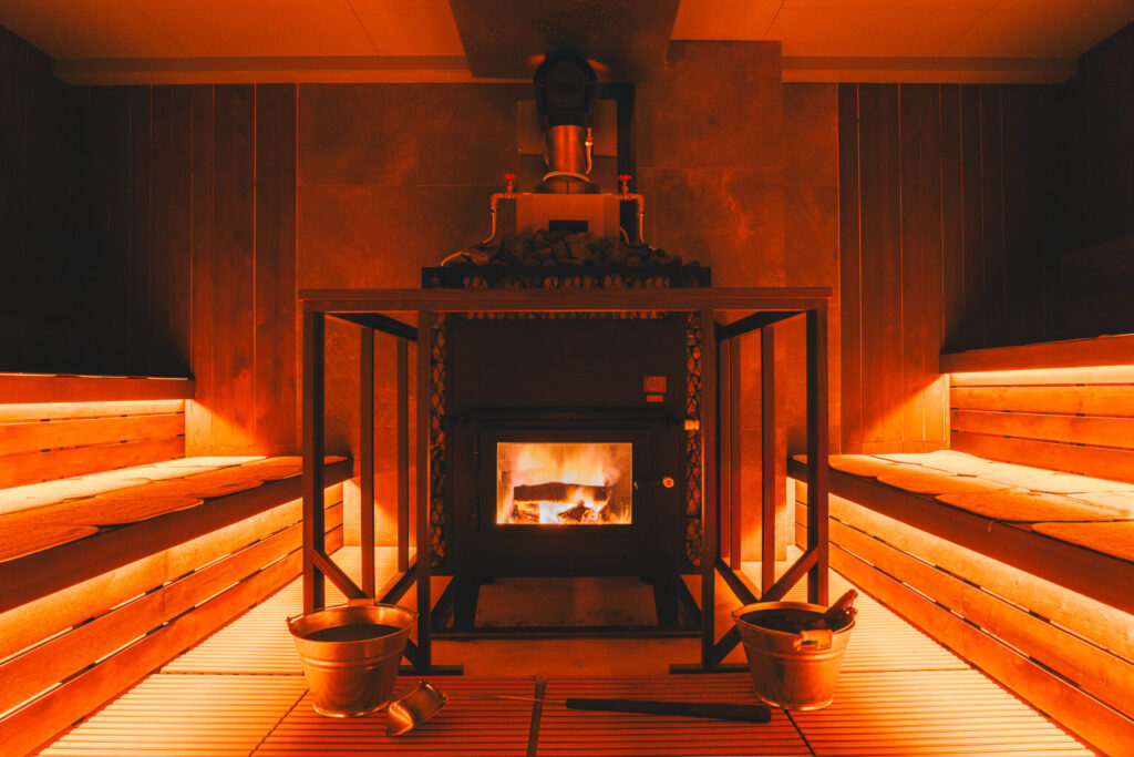最低限の明かりのサウナ室で、薪ストーブの窓から見える薪が燃える炎とその香りを楽しみながら
