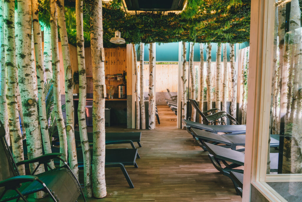 毎日サウナの休憩スペースは、たくさんの白樺の木や、天井や窓にびっしりと敷き詰められたグリーンに囲まれていることで、街の中にいながら森の中にいるような感覚になれます。