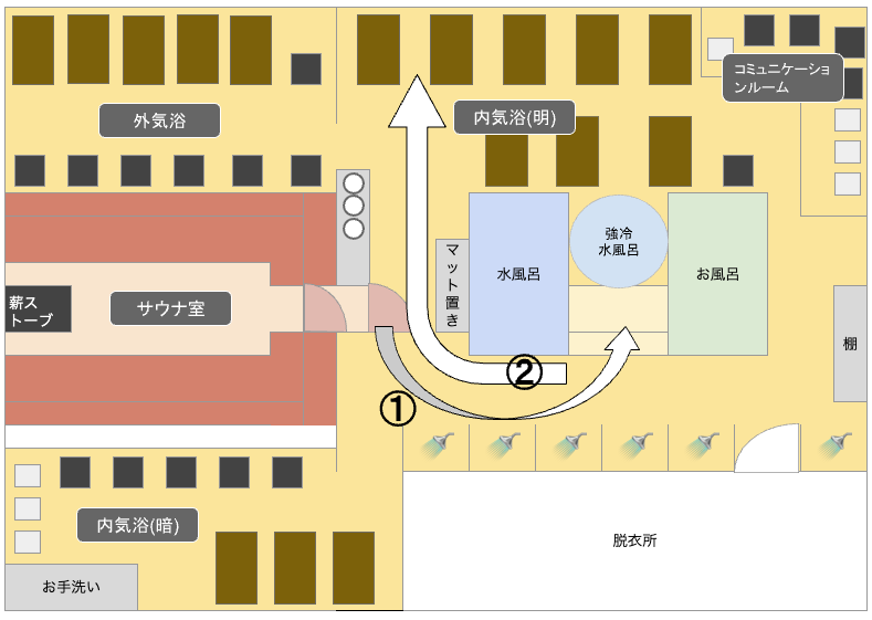 サウナ室→水風呂、水風呂→休憩スペースの動線は以下のとおりです。